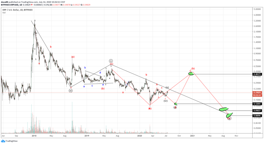 Криптовалютный трейдер @davecrypto83 поделился со своими читателями графиком XRP, демонстрирующим, что цена все еще корректируется. Согласно его прогнозам, пара может вырасти к $0.4, но затем запустит снижение в направлении $0.08.