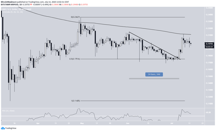 2 июня на графике появилась линия нисходящего сопротивления, которая поддерживалась на протяжении 34 дней. После того, как XRP упал к уровню Фибо 0.5 и отскочил от него, пара совершила бычий пробой этой линии нисходящего сопротивления, и с тех пор она росла все более ускоряющимися темпами. За это время индикатор RSI на дневном графике пересек снизу вверх отметку 50, что является бычьим сигналом.