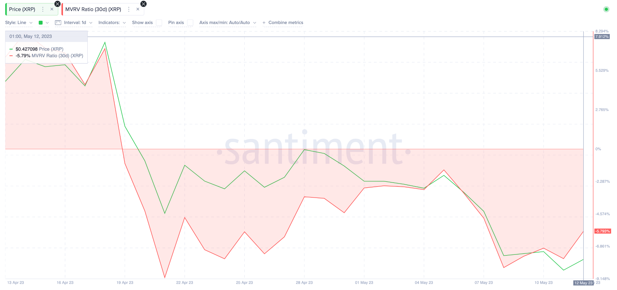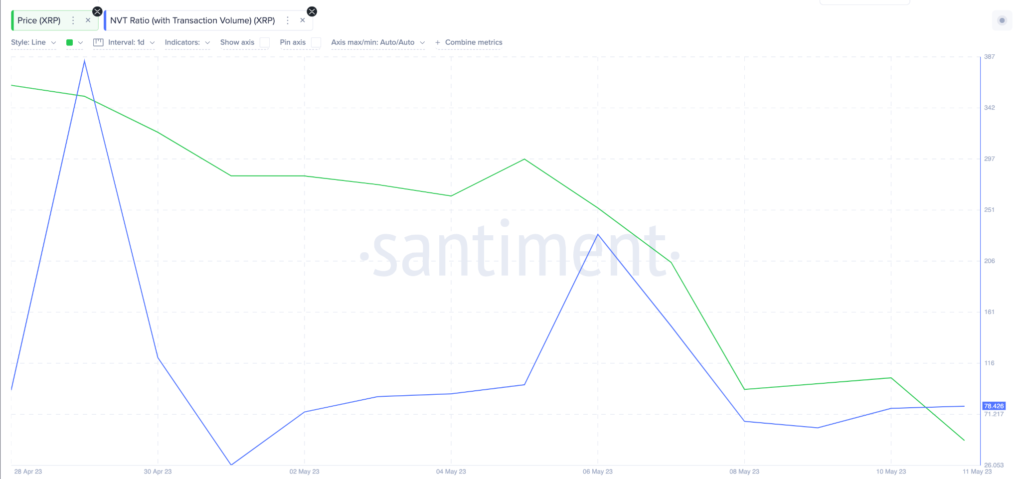 Показания индикатора NVT, который оценивает соотношение рыночной капитализации актива к объему транзакций, подтверждают возможность скорого разворота. Как видно на графике ниже, в период с 29 апреля по 12 мая коэффициент NVT снизился на 79% — с 383,53 до 78,43. Это доказывает, что на данный момент Ripple недооценен.