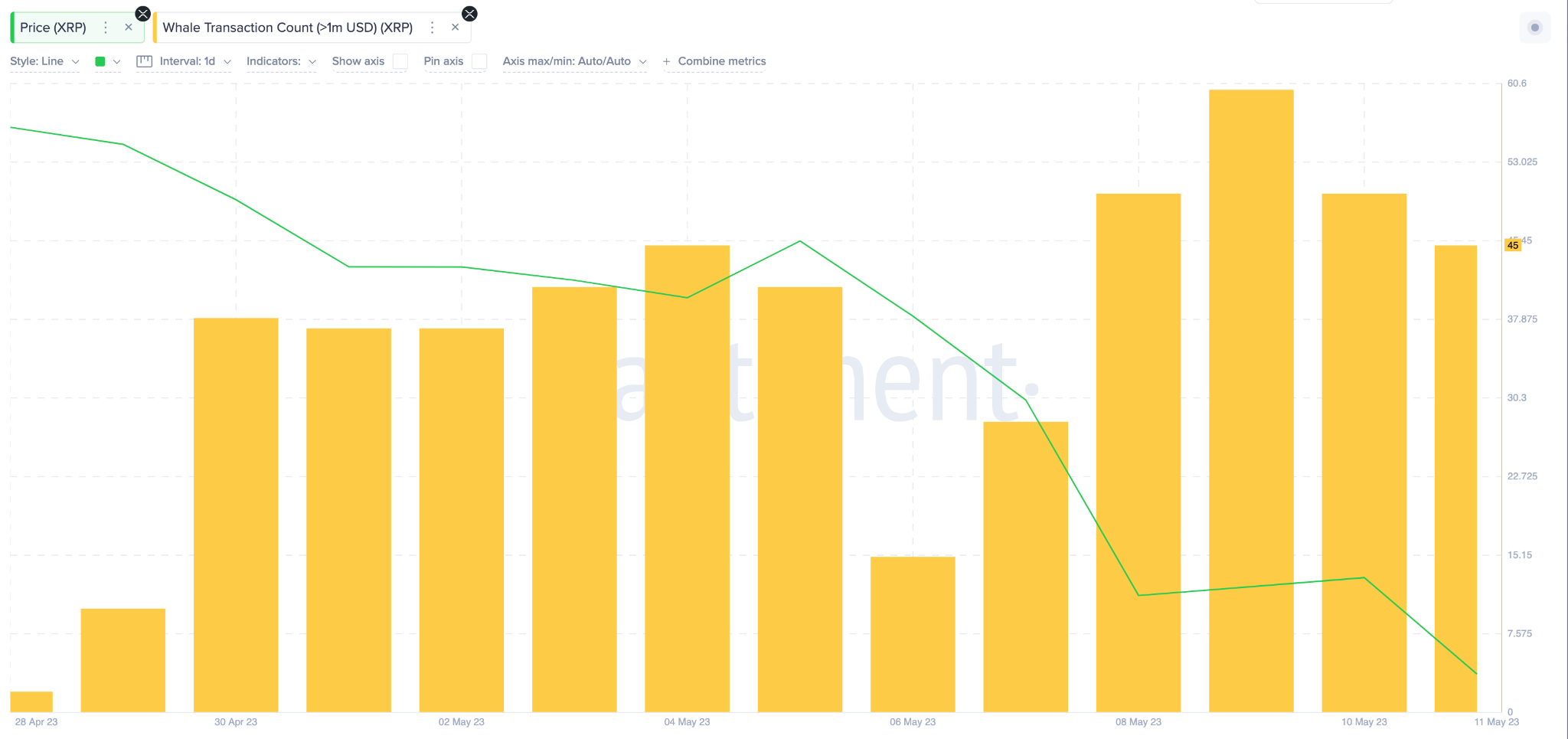 Киты XRP, похоже, возвращаются в большую игру. На графике ниже показано, что с 6 по 12 мая количество превышающих $1 млн ежедневных транзакций увеличилось с 15 до 45.