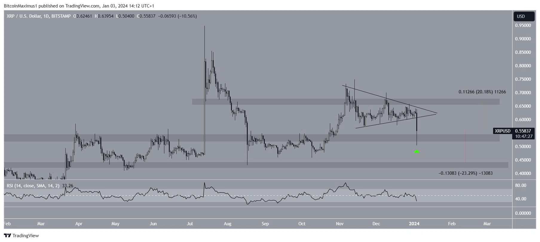 Технический анализ недельного таймфрейма показывает, что XRP растет вдоль восходящей линии поддержки с мая 2022 года. В этот период он пробил важную горизонтальную зону и достиг нового максимума 2023 года в июле.