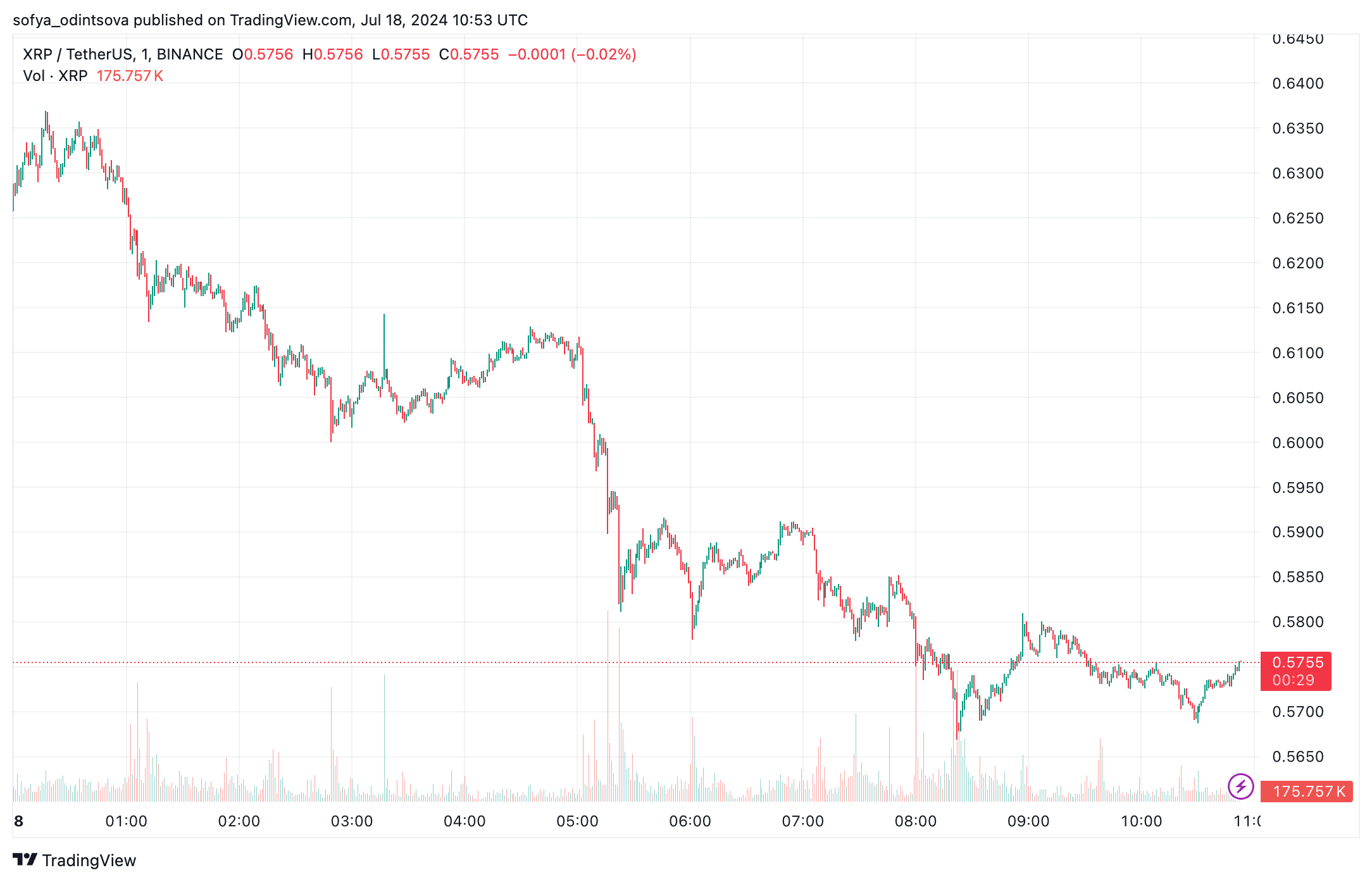В последние дни XRP — один из самых обсуждаемых на крипторынке активов. Сегодня, 18 июля, цена актива пробила многомесячный максимум на отметке в $0,62. К моменту написания материала показатель скорректировался до $0,57.
