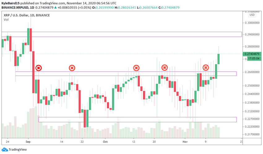 Если XRP все же возобновит рост, ближайшая область сопротивления встретит валюту в районе $0.295.