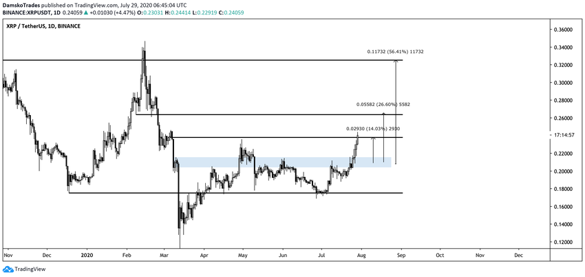 28 июля курс Ripple (XRP) пробил область долгосрочного сопротивления, которая сдерживала быков с марта 2019 года. Пока пара торгуется над этим уровнем, тренд будет считаться бычьим, и XRP может взять курс на следующее сопротивление.