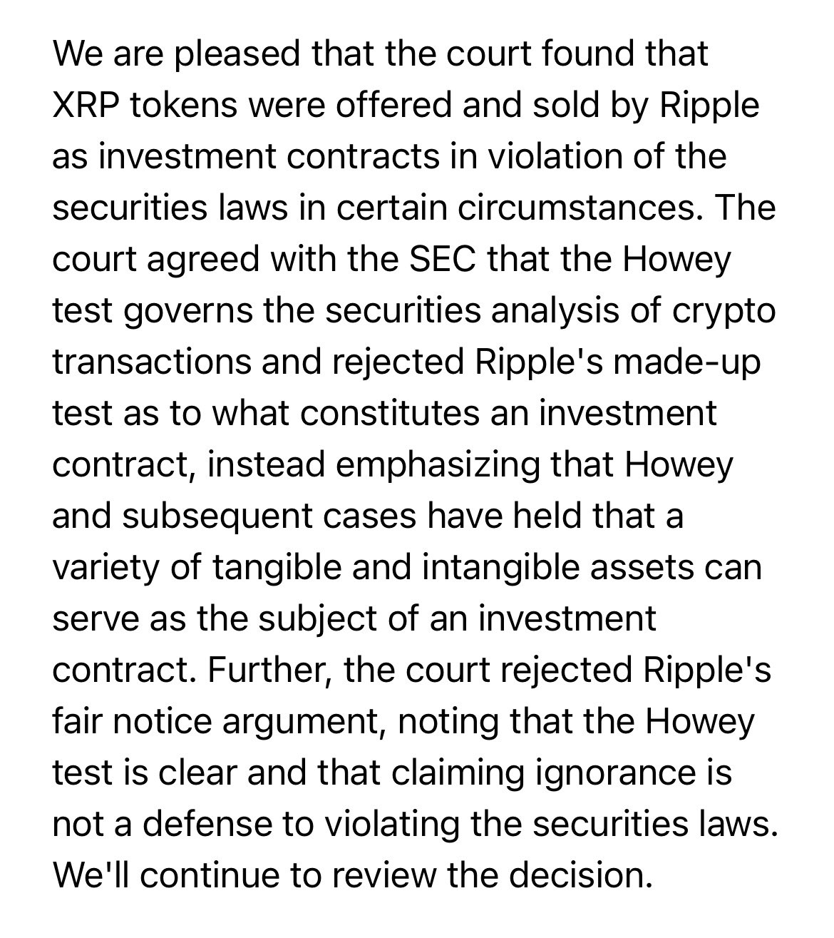 Несмотря на неоднозначность решения, руководители Ripple — в частности, генеральный директор Брэд Гарлингхаус, расценили его как шаг в правильном направлении.