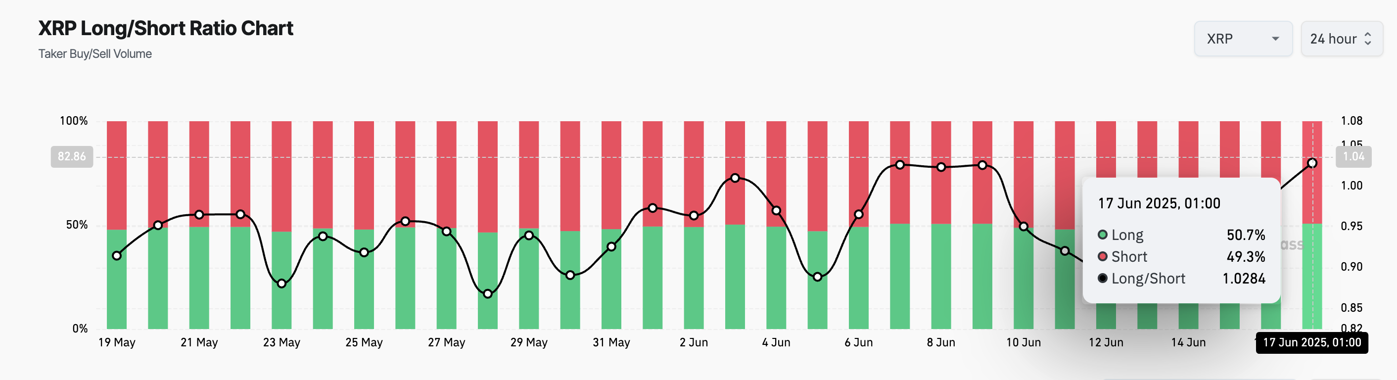 Кроме того, соотношение длинных и коротких позиций по XRP поддерживает оптимистичный прогноз. На момент написания показатель составляет 1,02. Значение больше единицы указывает на преобладание длинных позиций. Это значит, что больше трейдеров делают ставку на устойчивый рост цены.