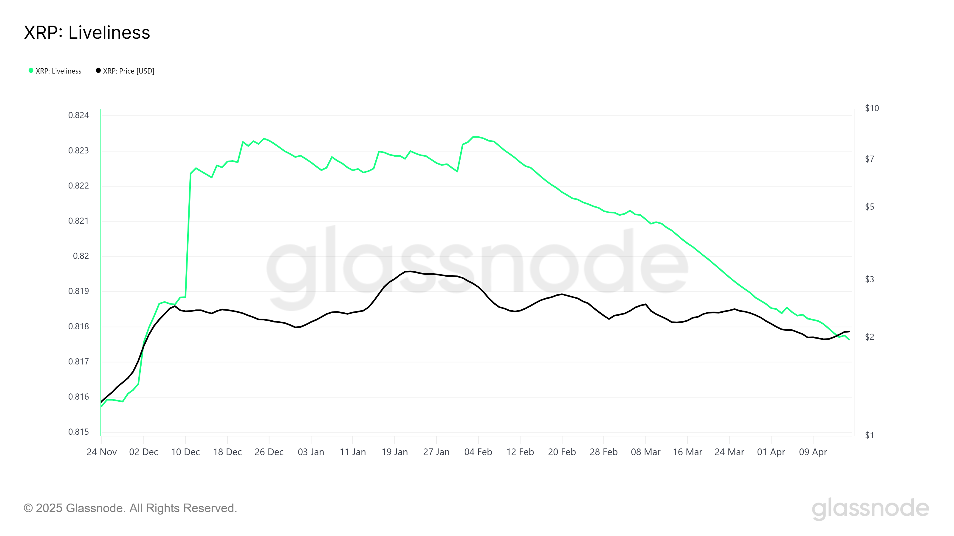 Метрика Liveliness, отслеживающая частоту транзакций, устойчиво снижается с февраля. Это означает, что меньше токенов меняют владельцев, что свидетельствует о накоплении XRP долгосрочными держателями по более низким ценам.