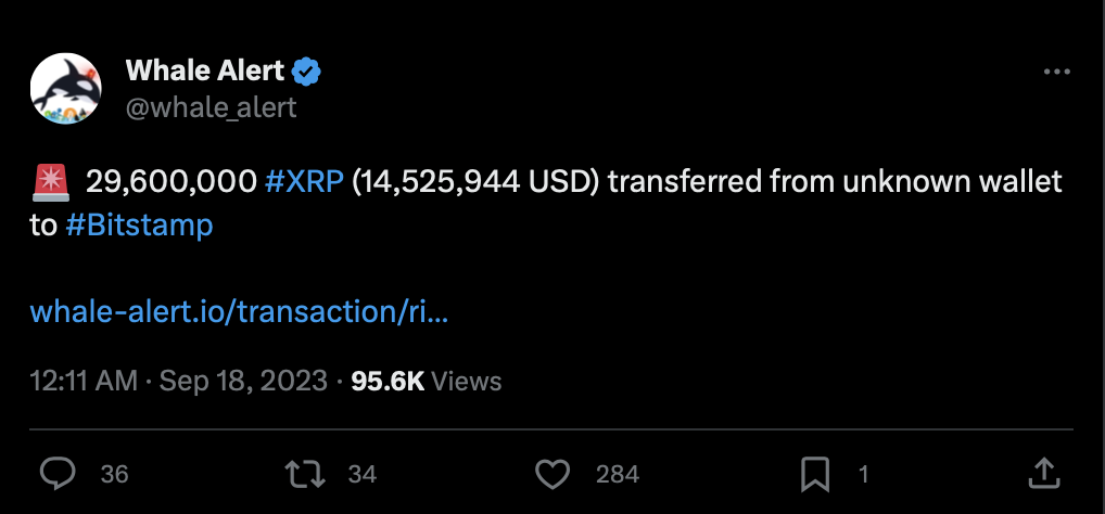 Платформа Whale Alert, отслеживающая крупные криптовалютные транзакции, первой заметила эту крупную сделку и сообщила о ней в «Твиттере». Хотя кошелек, с которого были отправлены XRP, является анонимным, аналитические данные Bithomp позволяют предположить, что он управляется Ripple.