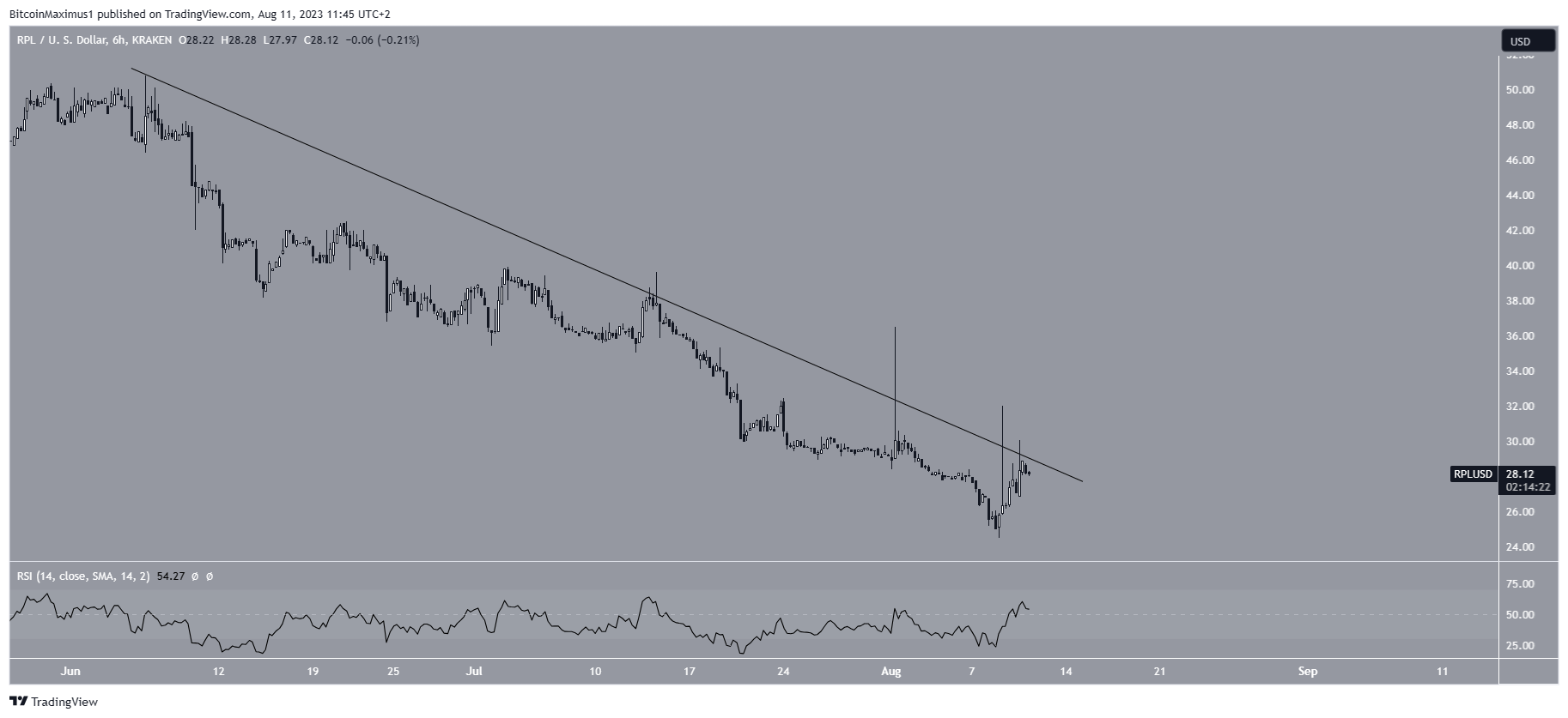 9 августа цена Rocket Pool (RPL) отскочила от важного уровня, подтвердив горизонтальную область $25 в качестве сопротивления, но так и не смогла прорваться выше нисходящей диагональной линии.