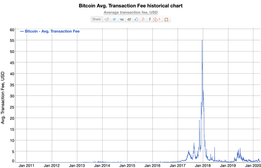 В такую цифру верится с трудом хотя бы потому, что, согласно блокчейн-статистике в сети биткоина, средняя стоимость комиссии, взимаемой за совершение операций с ВТС, никогда не превышала значения $55. Подобный пиковый скачок был зафиксирован лишь однажды в январе 2018 года.