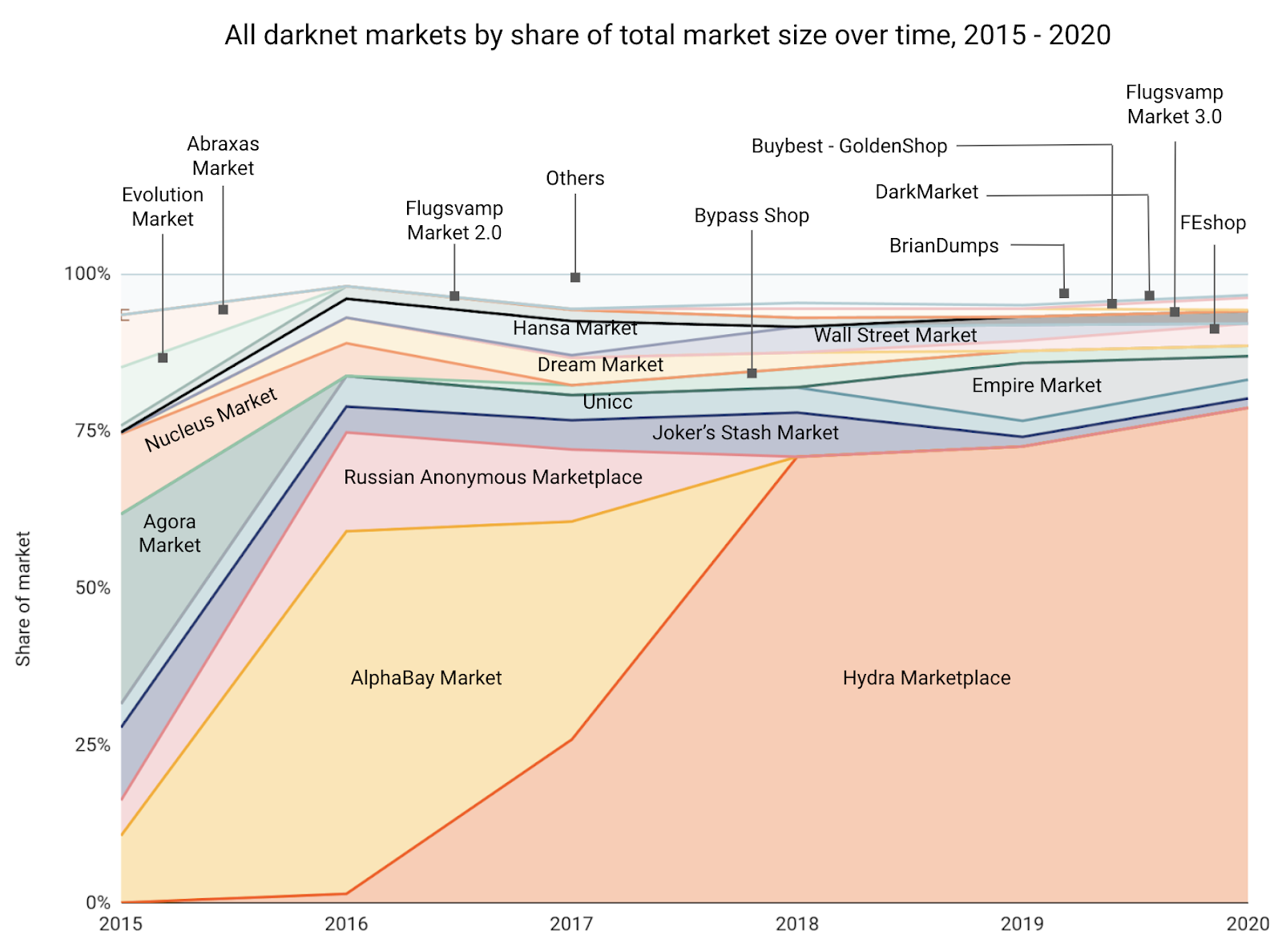 Аналитики Chainanalysis, отмечают, что если исключить Hydra, то доход от рынка даркнета с 2019 по 2020 год оставался примерно неизменным.