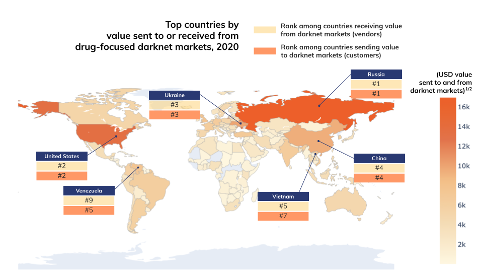 «Соединенные Штаты, Россия, Украина и Китай доминируют по стоимости как отправленных, так и полученных средств с рынков даркнета. Венесуэла и Вьетнам также занимают высокие позиции с обеих сторон. Их активность немного больше смещена в сторону покупок, что может быть связано с производством лекарств. Мы также подозреваем, что значительная часть объема Китая и России, полученная рынками даркнета, связана с отмыванием денег в этих странах», – говорится в отчете Chainanalysis.