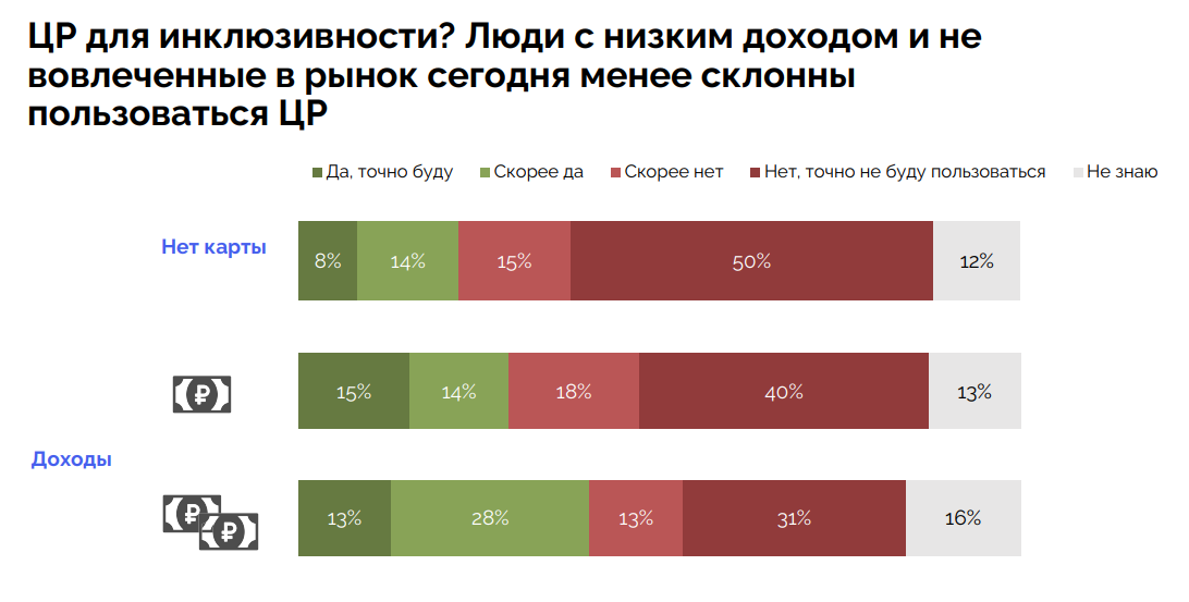 В самом СКОЛКОВО отмечают исключительно положительные настроения по цифровому рублю. Фактически же настроения по цифровой валюте от Центрального банка разделились поровну. Между тем, в самом исследовательском комплексе считают, что основными скептиками цифрового рубля являются люди с низким доходом и те, кто не вовлечен в рынок сегодня.