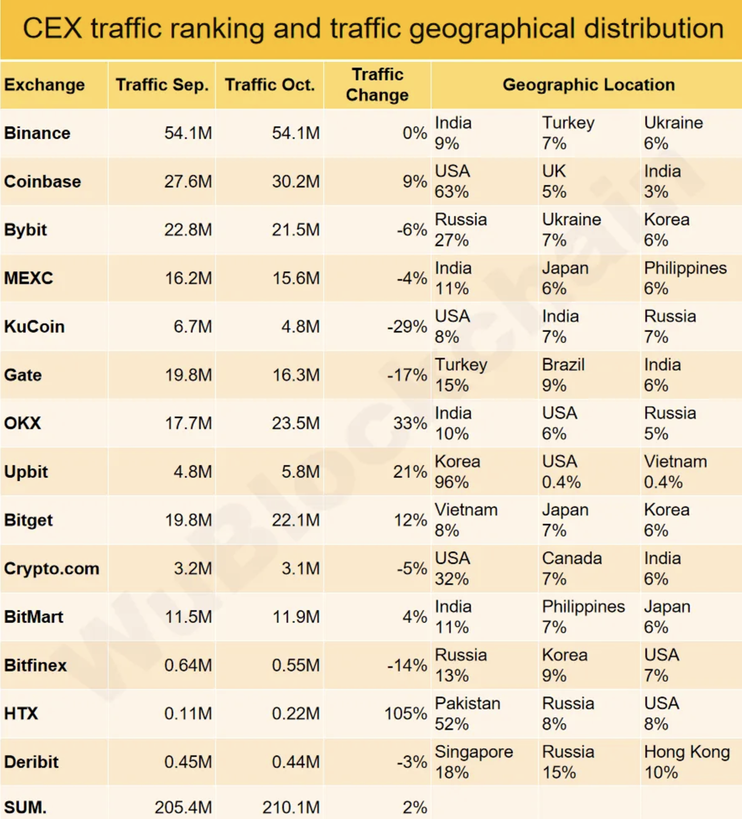 Предпочтения украинцев по сравнению с сентябрем не изменились: они выбирали Binance и Bybit. На Украину приходится 6% и 7% трафика этих криптобирж соответственно.