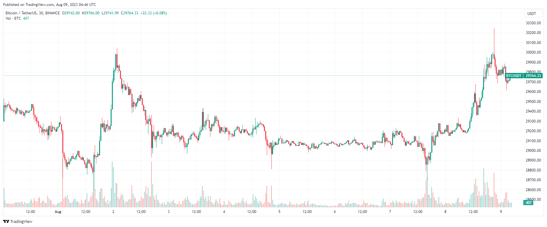 Вечером во вторник 8 августа биткоин прорвал уровень $30 тыс. Максимум стоимости криптовалюты за 24 часа, по данным ресурса CoinMarketCap, зафиксирован на уровне $30 176. После вспышки роста биткоин скорректировался к $29 700.