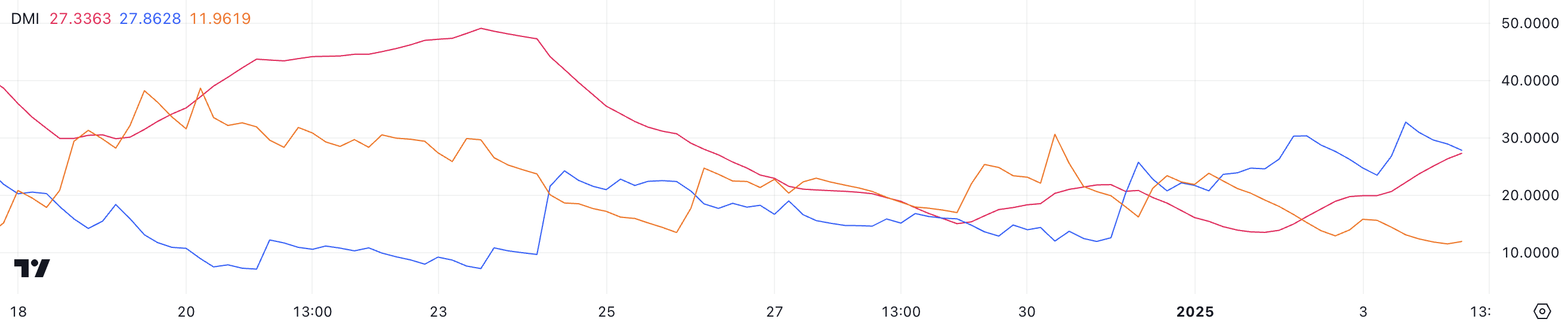 График DMI биткоина показывает, что его ADX сейчас находится уровне 27,3, что представляет значительный рост с 13,6 три дня назад. ADX, или средний индекс направления, измеряет силу тренда по шкале от 0 до 100, где значения выше 25 сигнализируют о сильном тренде, а значения ниже 20 указывают на слабый или отсутствующий импульс.
