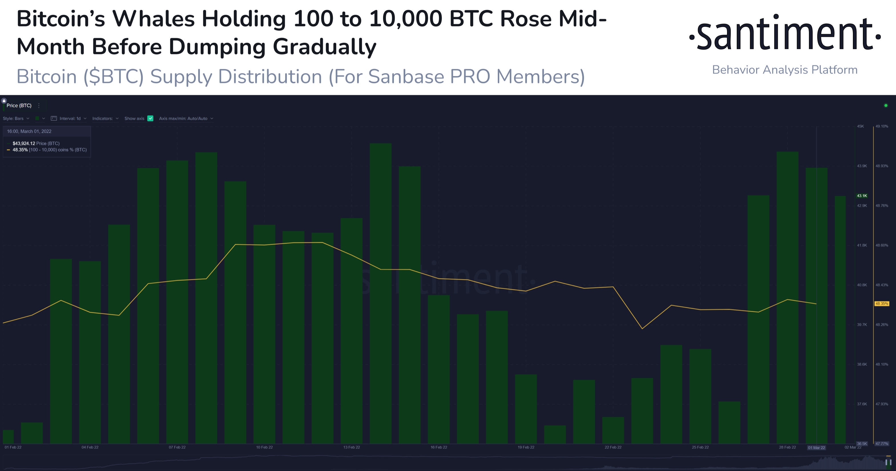 SponsoredПо мнению Santiment, рост USDT-резервов может говорить о более высокой готовности китов к закупке криптовалюты, чем месяц назад. В то же время объем биткоин-китов (от 100 BTC до 10 000 BTC) начал медленно, но снижаться. Начиная с двадцатых чисел февраля резервы китов стабильно снижаются.