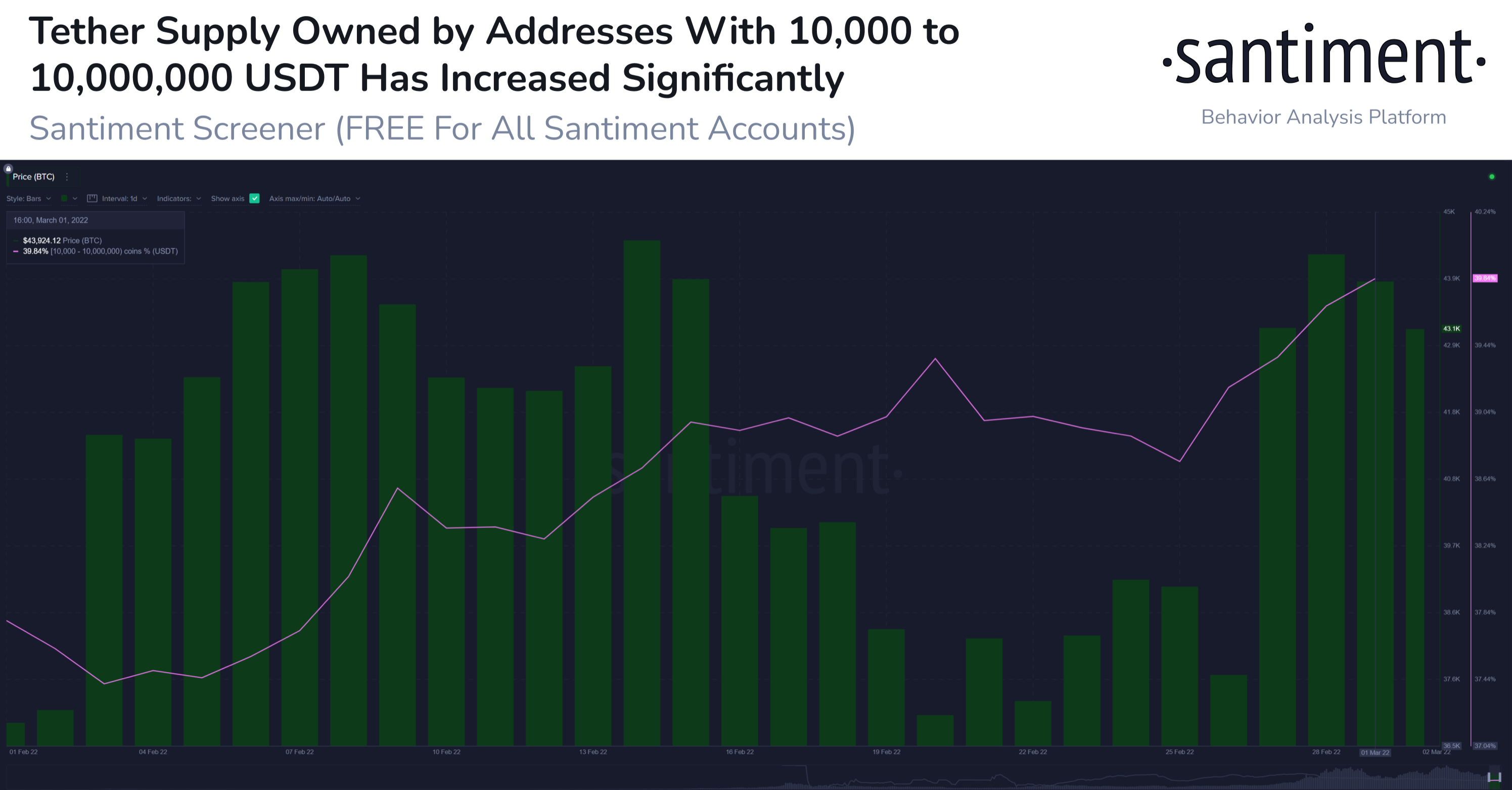 С конца февраля объем кошельков с балансом от 10 000 USDT начал активно расти, выяснили аналитики ресурса Santiment