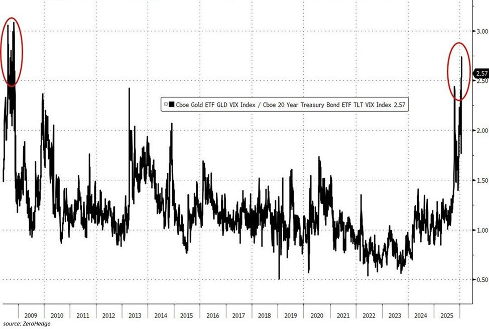 Соотношение индекса волатильности золотого ETF GLD к индексу волатильности долгосрочных казначейских облигаций США TLT достигло 2,7 пункта. Это максимальное значение с 2008 года. С ноября показатель вырос примерно в два раза.