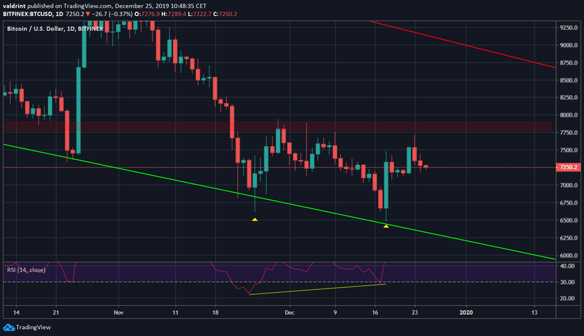 Биткоин просел к области поддержки $7200, превратив в поддержку линию нисходящего сопротивления. Мы продолжаем ожидать роста в направлении $7800.