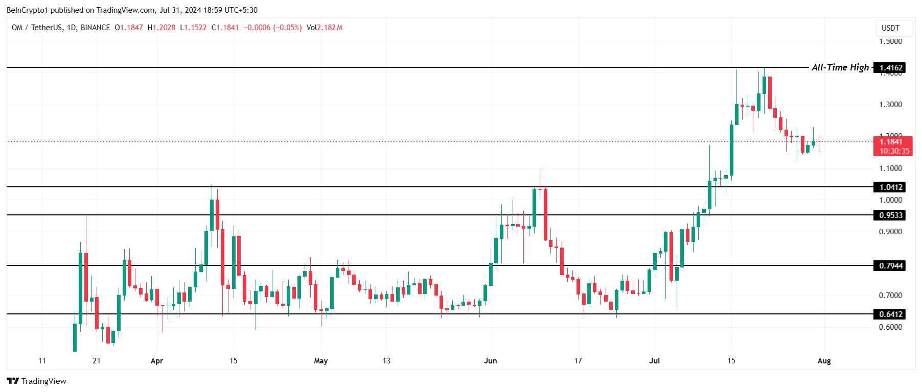 Если поддержка на $1,04 также не устоит, у OM еще будет шанс отскочить от $0,95. Утрата и этого уровня может отправить RWA-токен к отметке $0,79.