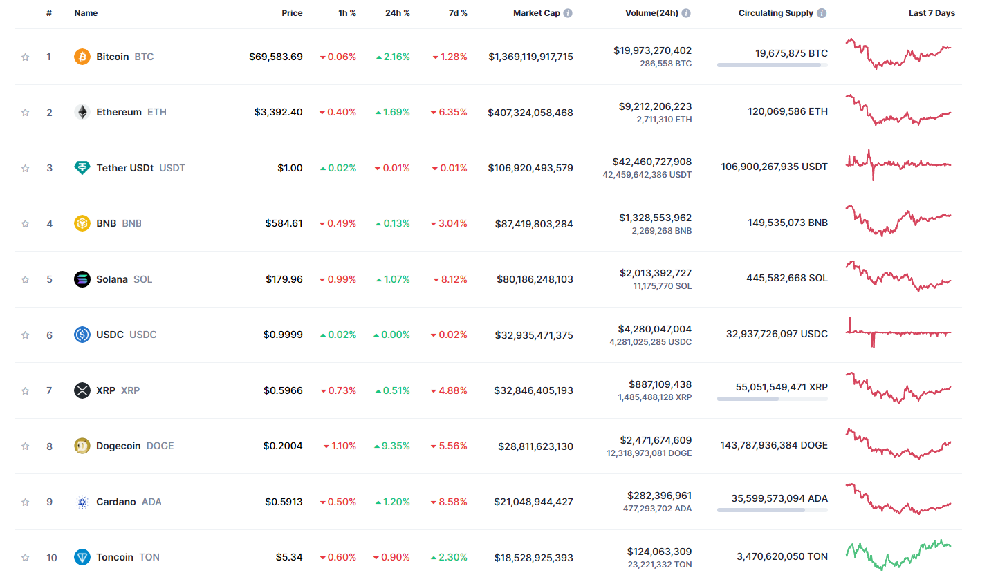 - Единственной монетой из первой десятки криптовалют, удержавшейся в небольшом плюсе, стал Toncoin (TON). На момент написания он торговался, по данным Сoinmarketcap, в районе $5,34 с внутринедельным повышением на 2,3%. Читайте также: За какими уровнями наблюдать, пока Toncoin (TON) консолидируется.
