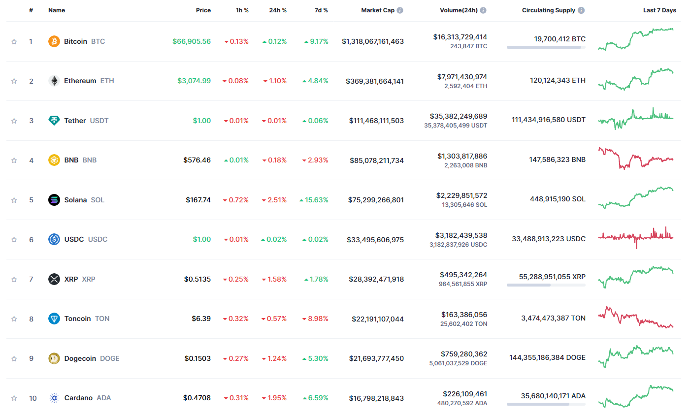 Биткоин (BTC) в середине недели вышел в рост и взлетел с $62 000 до $66 000 на фоне выхода данных об инфляции в США. Индекс потребительских цен (ИПЦ), который измеряет базовую инфляцию в США, вырос в апреле меньше прогнозов. Эта цифра предполагает возможное снижение инфляции и дает инвесторам надежду на снижение процентной ставки Федрезерва. После этого BTC продолжил укрепление, передвигая локальный максимум к уровням середины апреля. На момент написания монета торговалась, по данным Сoinmarketcap, в районе $66 905, с повышением на 9,17%. Читайте подробнее о трех причинах роста BTC.