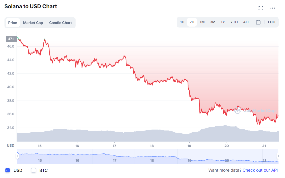 Главным неудачником недели среди валют топ-10 оказался коин Solana (SOL). Он подешевел за неделю на 24,38% и торговался на момент написания в районе $35.62.
