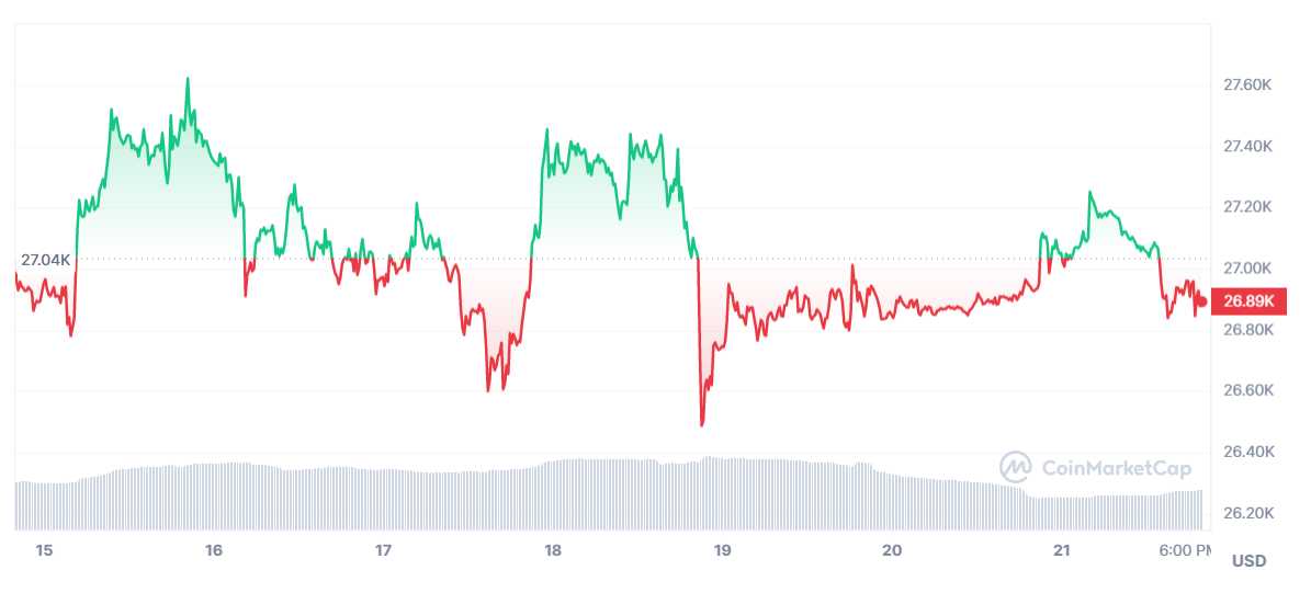 Уходящая неделя оказалась совершенно невыразительной для биткоина (BTC). Главная криптовалюта мира открыла ее на подступах к «круглому» психологическому уровню $27 000 и завершает на тех же позициях, несмотря на несколько попыток пробить критический уровень сопротивления $27 500.