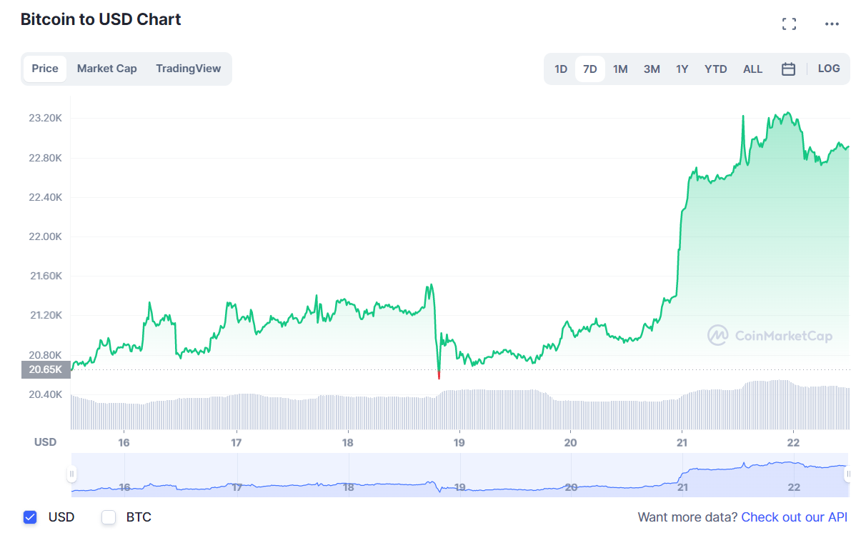 Уходящая неделя оказалась удачной для биткоина (BTC). За эти семь дней главная криптовалюта мира несколько раз обновила максимумы 2023 года. Сначала она прорвалась выше значимой психологической отметки $20 000, а вскоре преодолела и следующие круглые уровни $21 000 и $22 000.