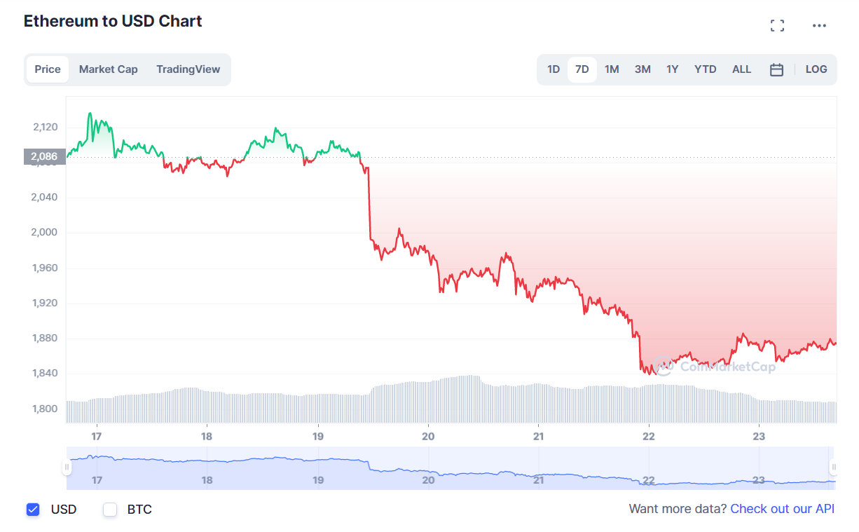 На момент написания ETH торговался с внутринедельным понижением на 10,36% в районе $1 872, согласно данным Сoinmarketcap.