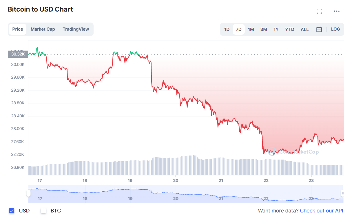 На момент написания в воскресенье ВТС торговался, по данным аналитического ресурса CoinMarketCap, в районе $27 661, с внутринедельным понижением на 8,77%.