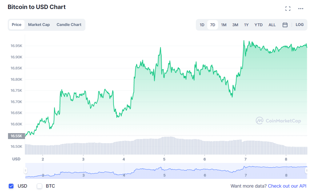 Уходящая неделя оказалась условно удачной для биткоина (BTC). На момент написания днем в воскресенье ВТС торговался, по данным аналитического ресурса CoinMarketCap, в районе $16 940, с внутринедельным повышением на 2,4%. Однако, с другой стороны, коин снова провел неделю в крайне узком боковике.