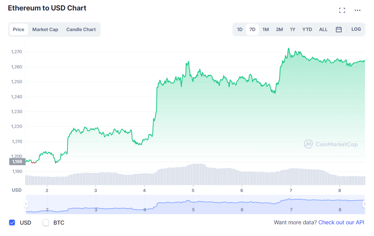 Тем временем курс нативного коина блокчейна Ethereum (ETH) тоже, как и BTC, попытался укрепиться и, в отличие от BTC, смог добиться чуть большего успеха. На момент написания ETH торговался с внутринедельным повышением на 5,6% в районе $1 263, согласно данным Сoinmarketcap.