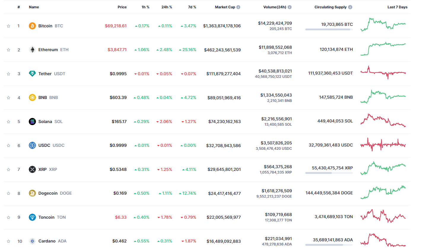 Стоимость биткоина (BTC) в начале недели также начала резко расти и превысила отметку $71 000 на фоне оптимизма вокруг спотовых Ethereum-ETF. За 24 часа общая сумма ликвидаций на рынке составила $348,13 млн, причем львиная их доля пришлась на короткие позиции. Впрочем, впоследствии монета откатилась и на момент написания торговалась, по данным Сoinmarketcap, в районе $69 218, с внутринедельным повышением на 3,47%.