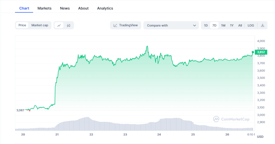 В лидеры роста вырвался Ethereum (ETH). За эту семидневку он вырос на момент написания на 25,16% и торговался в районе $3850, согласно данным Сoinmarketcap.