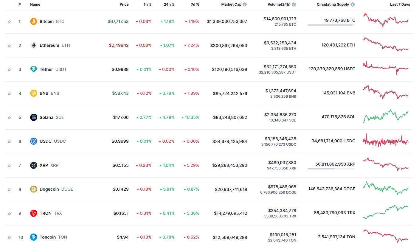 Биткоин (BTC) не смог развить рост предыдущей недели и не сумел удержаться над круглой отметкой $68 000, откатившись ниже нее уже в понедельник. Впрочем, коррекция оказалась неглубокой. На момент написания валюта торговалась, по данным Сoinmarketcap, в районе $67 717, с внутринедельным понижением на 1,19%.