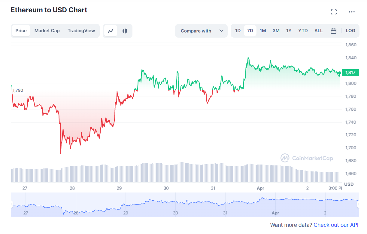На момент написания ETH торговался с внутринедельным повышением на 1,47% в районе $1 817, согласно данным Сoinmarketcap.
