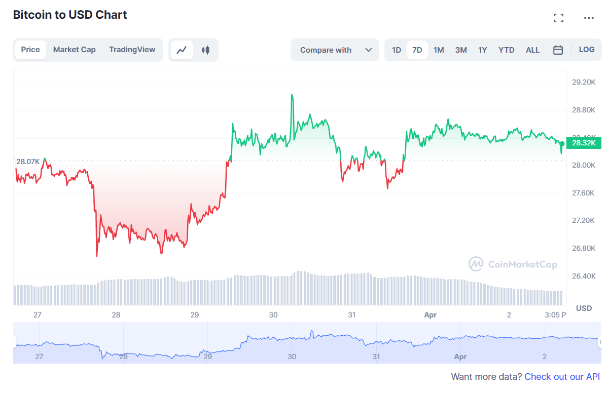 На момент написания в воскресенье ВТС торговался, по данным аналитического ресурса CoinMarketCap, в районе $28 317, с внутринедельным повышением на 1%.