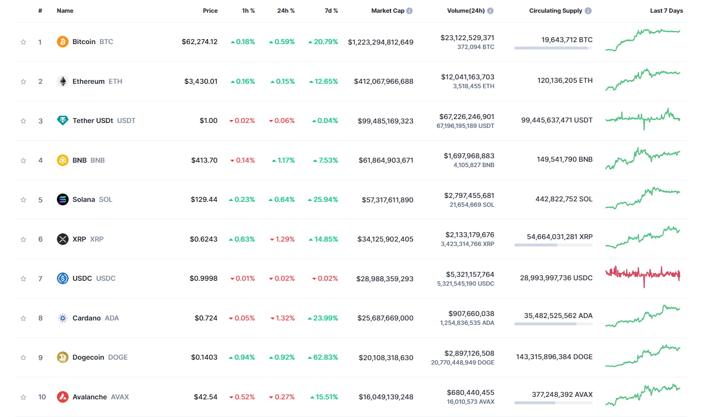 - Между тем лидером в первой десятке криптовалют оказался мемный токен Dogecoin (DOGE). На момент написания он торговался, по данным Сoinmarketcap, в районе $0,1403 с внутринедельным повышением на 62,83%.
