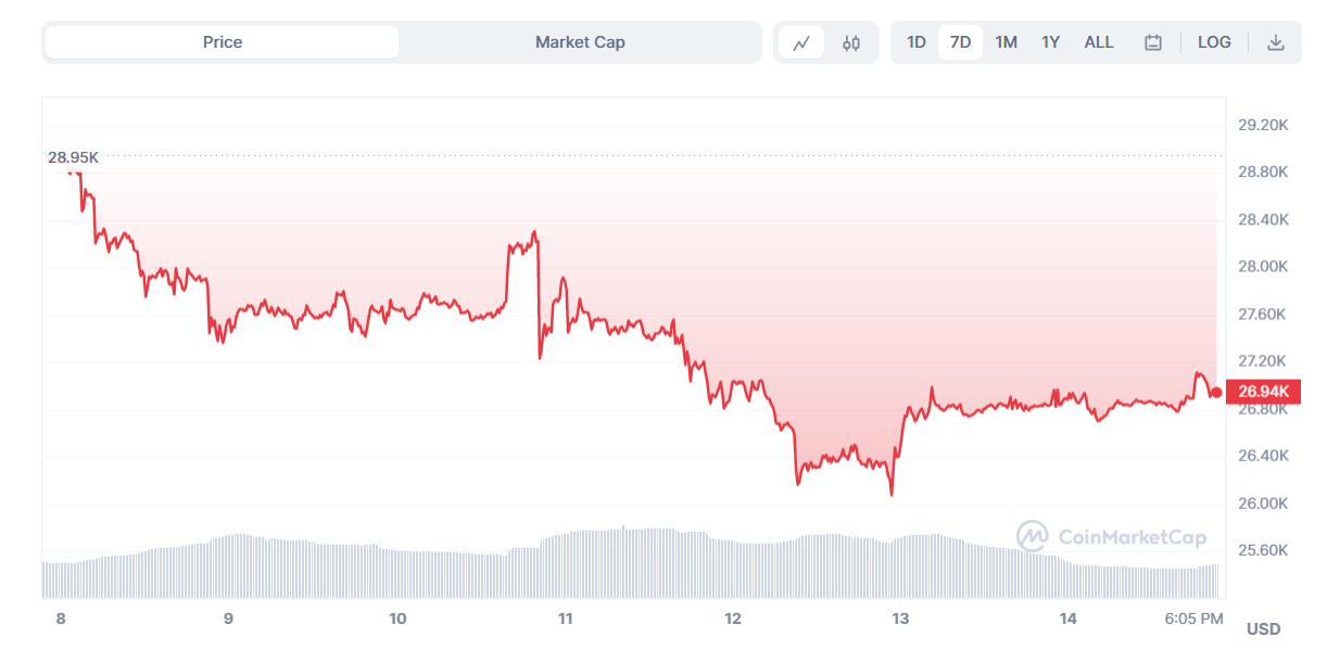 На момент написания в воскресенье ВТС торговался, по данным аналитического ресурса CoinMarketCap, в районе $26 954, с внутринедельным понижением на 6,9%.