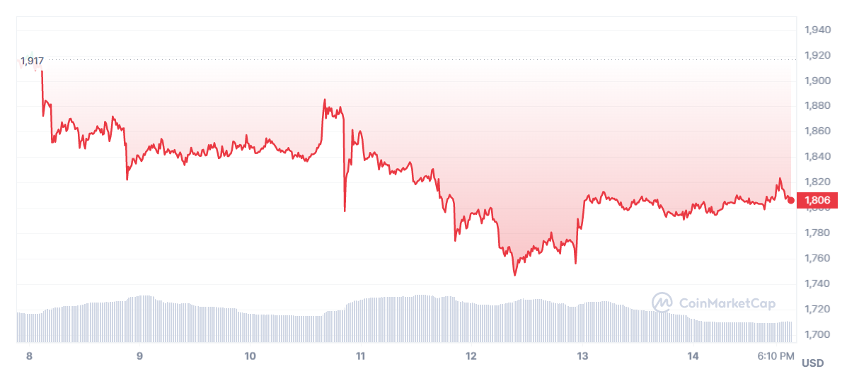 Тем временем курс нативного коина блокчейна Ethereum (ETH) держался чуть лучше, по крайней мере, по сравнению с ВТС. На момент написания ETH торговался с внутринедельным понижением на 5,8% в районе $1 806, согласно данным Сoinmarketcap.