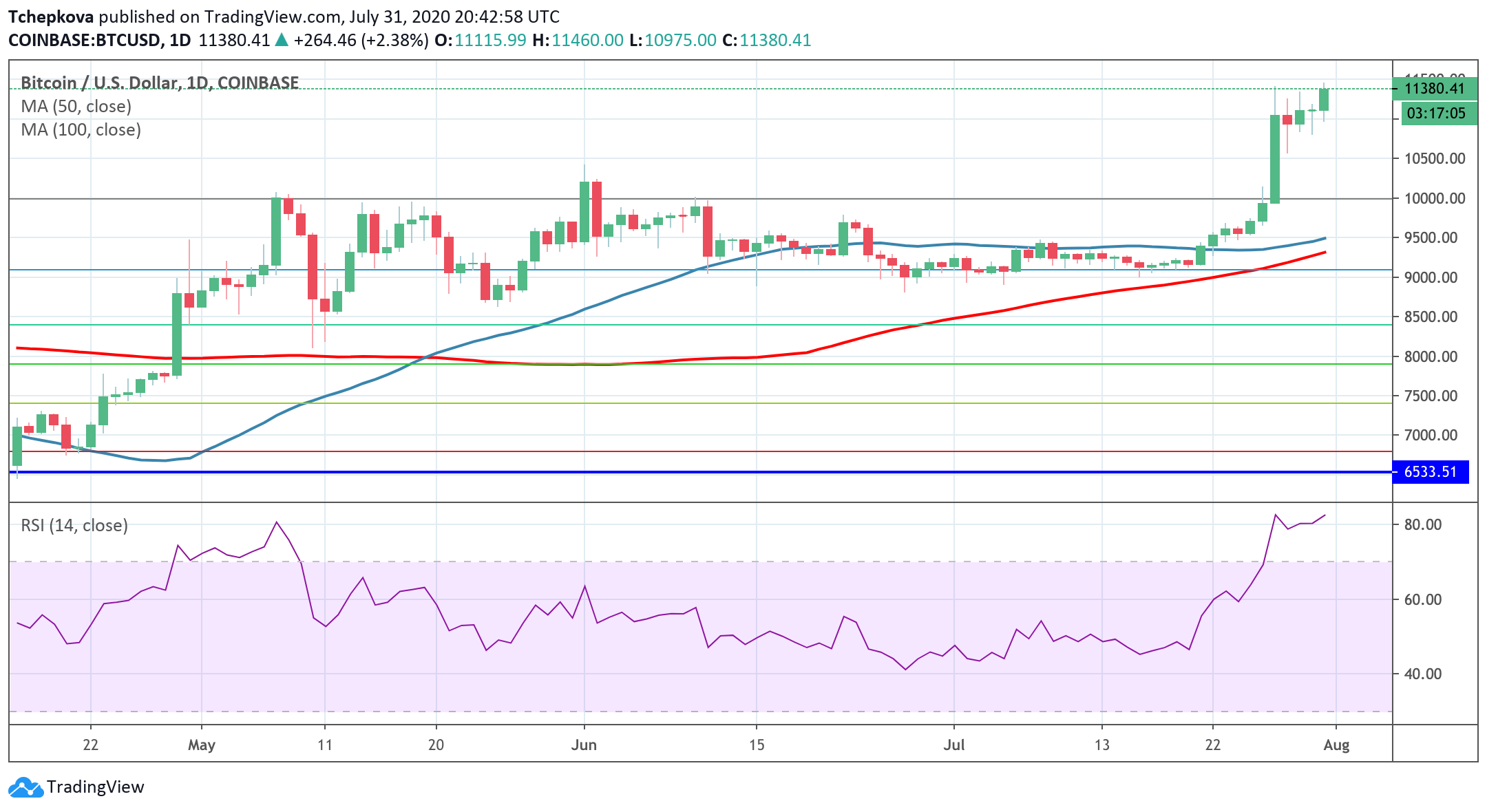 Первая криптовалюта в пятницу на американской торговой сессии тестировала отметку $11 467, преодолев тем самым предыдущий исторический максимум на уровне $11 394. В июле биткоин подорожал на 24%, при этом только за минувшую неделю рост превысил 18%. Сейчас цена на биткоин находится в зоне перекупленности, о чем свидетельствует значение индекса относительной силы (RSI).
