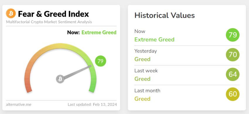 12 февраля курс первой криптовалюты достиг $50 тыс. — самого высокого показателя с ноября 2021 года. Индекс страха и жадности показывает, что рынок перешел в зону «крайней жадности».