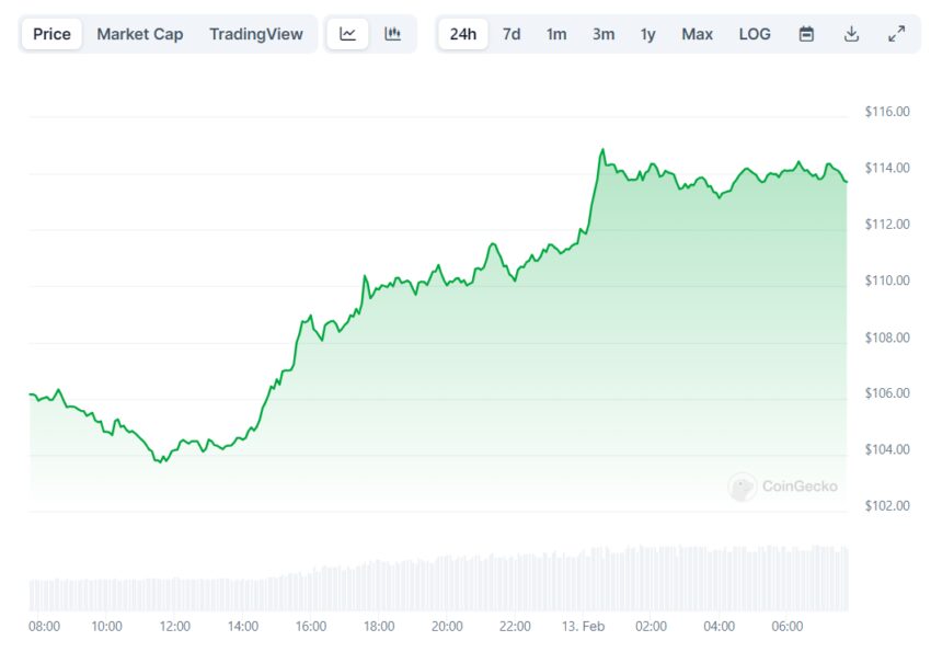 Одним из лидеров роста стала Solana (SOL). Цена токена экосистемы сейчас составляет $113, укрепившись за прошедшие сутки на 6,9%.