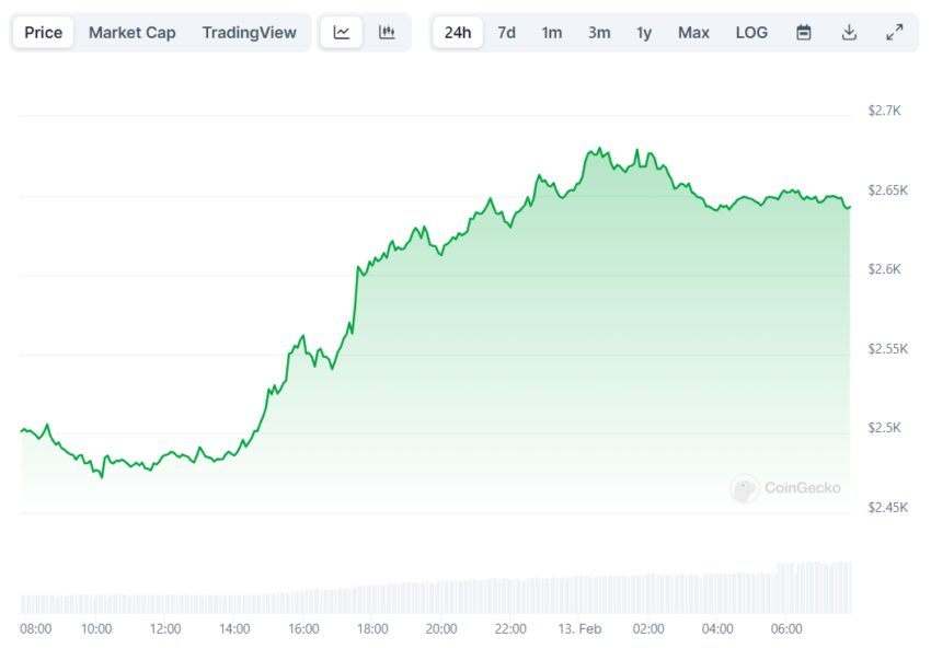 Вместе с биткоином вырос и Ethereum (ETH). Стоимость второй криптовалюты вернулась к уровню в $2 600 и продолжает расти. За последние 12 часов показатель увеличился на 5,6%.