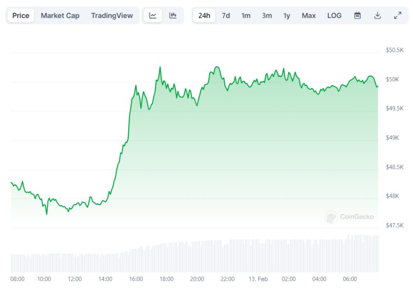 12 февраля BTC добрался до $50 000 — уровня декабря 2021 года. По данным CoinGecko, на момент написания материала первая криптовалюта торгуется по $49 965. Самый высокий показатель за прошедшие сутки был зафиксирован на $50 259, а самый низкий — на $47 728.