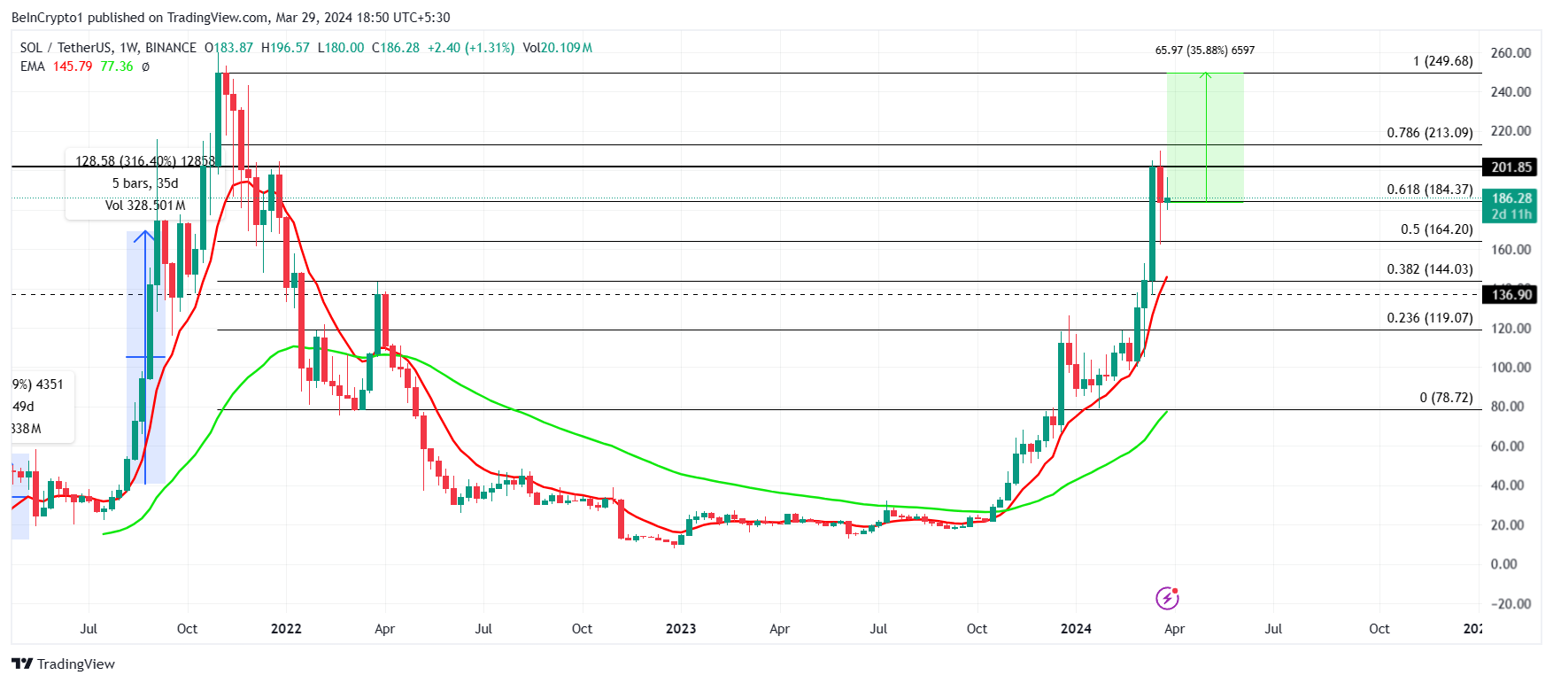 В настоящее время SOL тестирует уровень 61,8% коррекции Фибоначчи в качестве поддержки. Это может подтолкнуть альткоин к ралли на 35,88% и достижению важного сопротивления $250.
