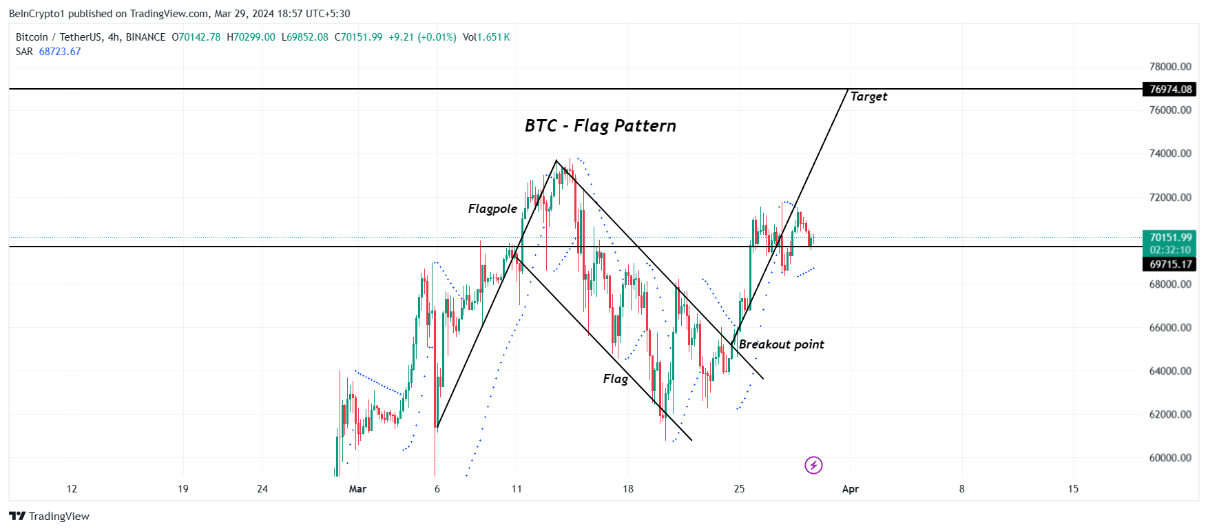 В марте цена биткоина достигла нового исторического максимума в $73 750, а затем перешла к коррекции. Это привело к тому, что криптовалюта сформировала паттерн «нисходящий флаг» на 4-часовом графике. В начале этой недели BTC вырвался из модели из в настоящее время торгуется на уровне $70 151.
