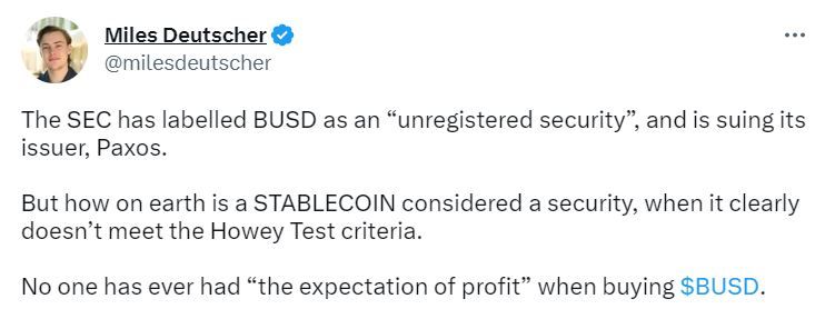 Утром 13 февраля в СМИ появились сообщения о том, что SEC считает третий по капитализации стейблкоин BUSD ценной бумагой. Напомним, согласно тесту Хауи, таким статусом может обладать актив, владение которым подразумевает получение прибыли.
